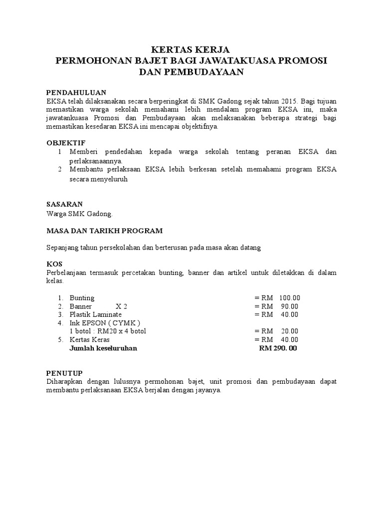 ANGGARAN PERBELANJAAN LAMPIRAN 3 12. Contoh kertas kerja permohonan dana. PERMOHONAN BAJET BAGI JAWATAKUASA PROMOSI DAN PEMBUDAYAAN PENDAHULUAN EKSA telah dilaksanakan secara berperingkat di SMK Gadong sejak tahun 2015.